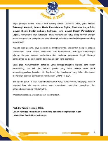 Saya percaya bahwa melalui lima cabang lomba DIMAS-TI 2024, yaitu Inovasi